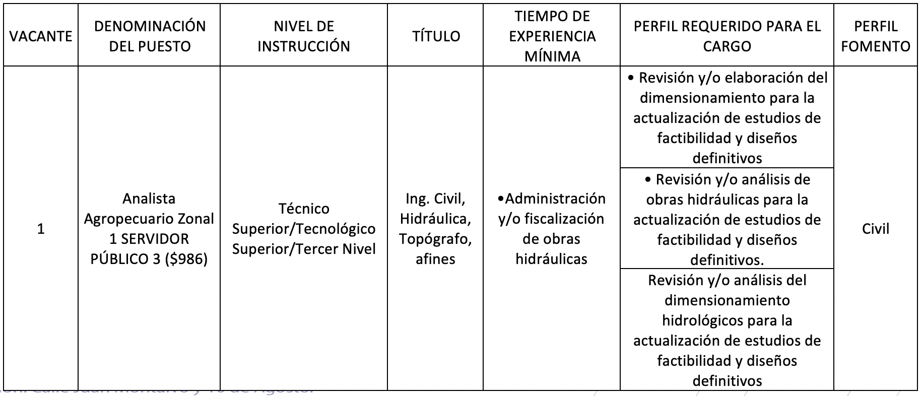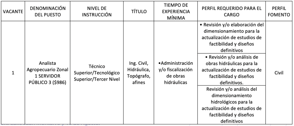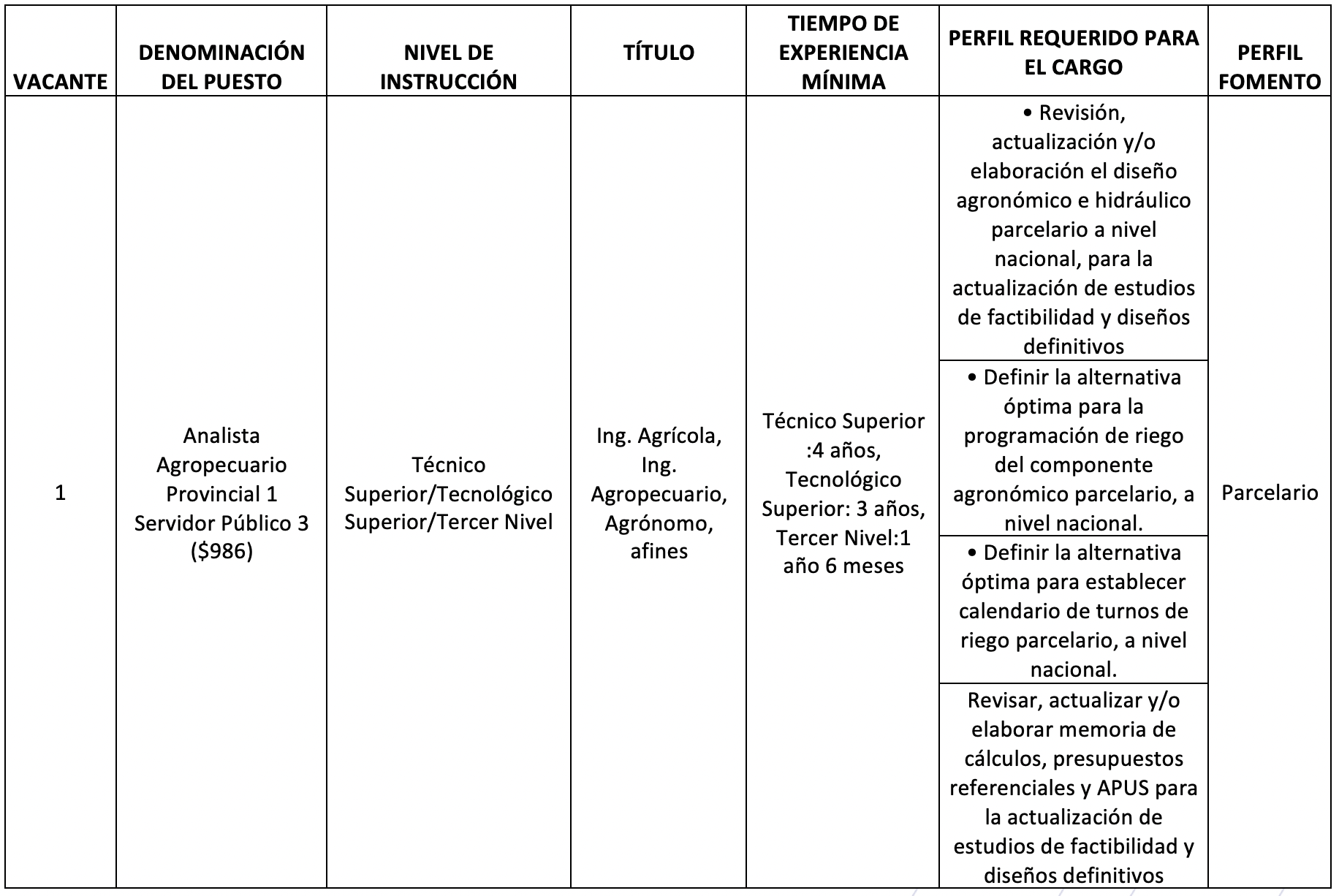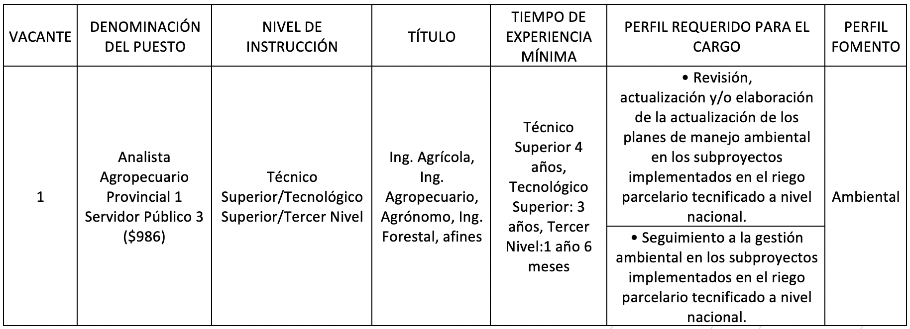 EL MINISTERIO DE AGRICULTURA, GANADERÍA Y PESCA, A TRAVÉS DE LA DIRECCIÓN DISTRITAL 24D01 – SANTA ELENA – MAGP, CONVOCA A PROCESO DE SELECCIÓN DE PERSONAL PARA LABORAR BAJO EL SISTEMA DE CONTRATO DE SERVICIOS OCASIONALES EN EL PROYECTO FOMENTO A LA PRODUCCIÓN AGRÍCOLA, MEDIANTE LA IMPLEMENTACIÓN DE SISTEMAS DE RIEGO PARCELARIO, TECNIFICACIÓN AGRÍCOLA Y APÍCOLA – DIRECCIÓN DISTRITAL 24