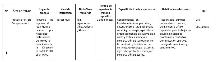 EL MINISTERIO DE AGRICULTURA Y GANADERÍA, A TRAVÉS DE LA DIRECCIÓN DISTRITAL DE LOJA, CONVOCA A PROCESO DE SELECCIÓN DE PERSONAL PARA LABORAR BAJO EL SISTEMA DE CONTRATO DE SERVICIOS OCASIONALES.