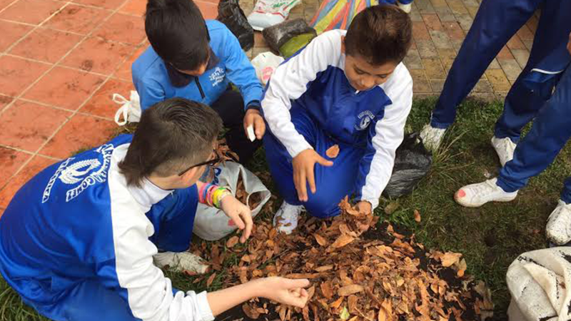 Estudiantes en el proceso de elaborar compost.