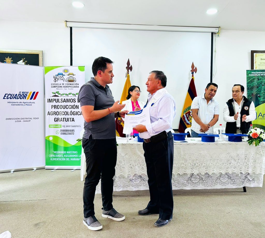 Loja, 11 de diciembre de 2025.- El Ministerio de Agricultura, Ganadería y Pesca (MAGP) participó en la clausura e incorporación del proceso formativo de la Escuela de Formación Campesina Agropecuaria y Comunidad de Aprendizaje Malacatos, desarrollado entre marzo y diciembre de 2025 en la parroquia Malacatos.